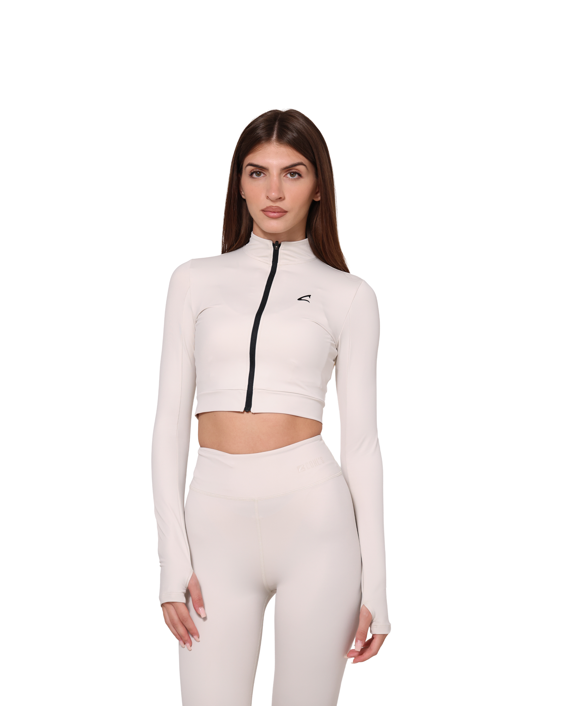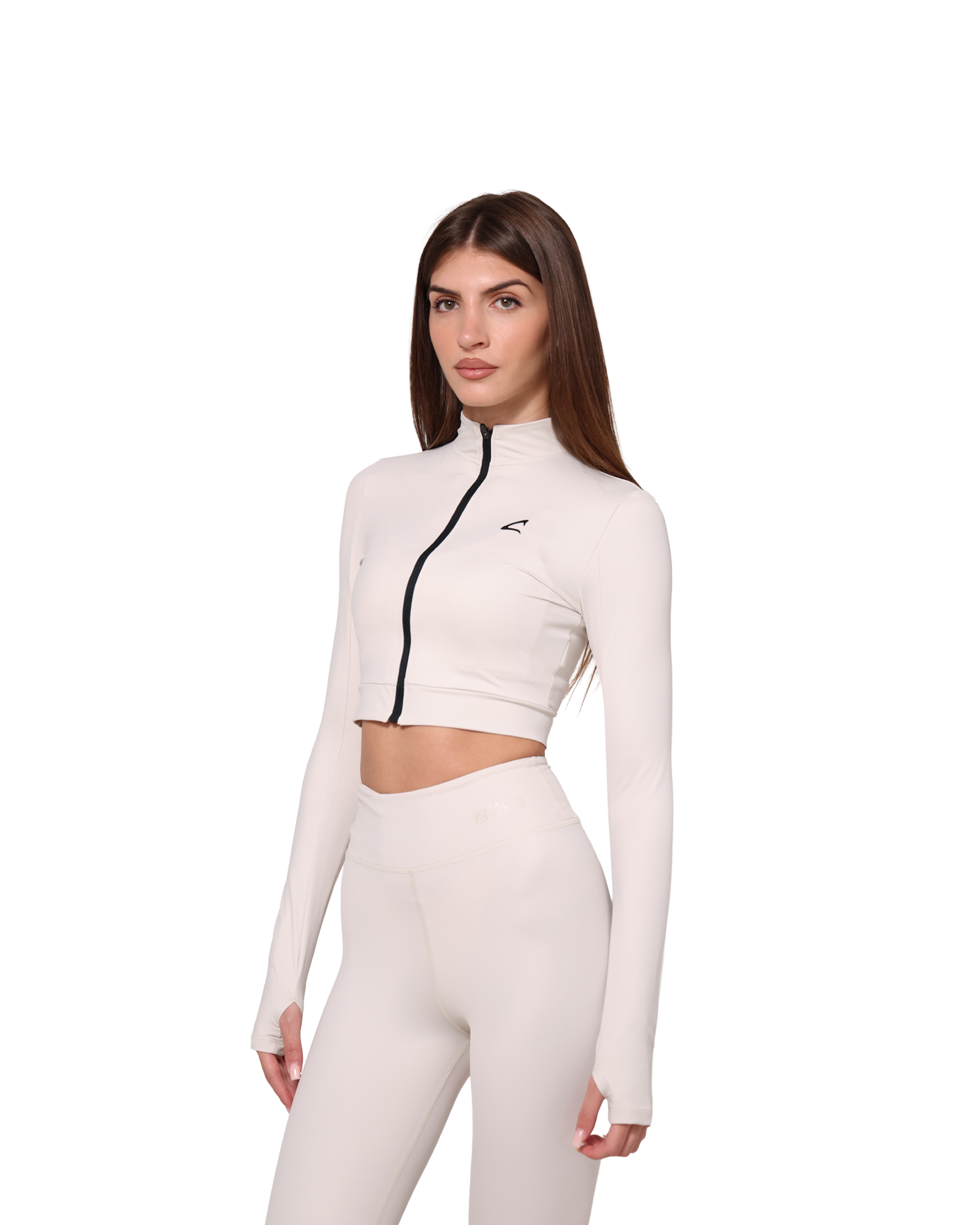 A slim fit cropped jacket with a front zip, high neck, and thumbholes, made from recycled materials. The bielastic fabric offers shape retention, UV protection, and pilling resistance for lasting comfort and performance.