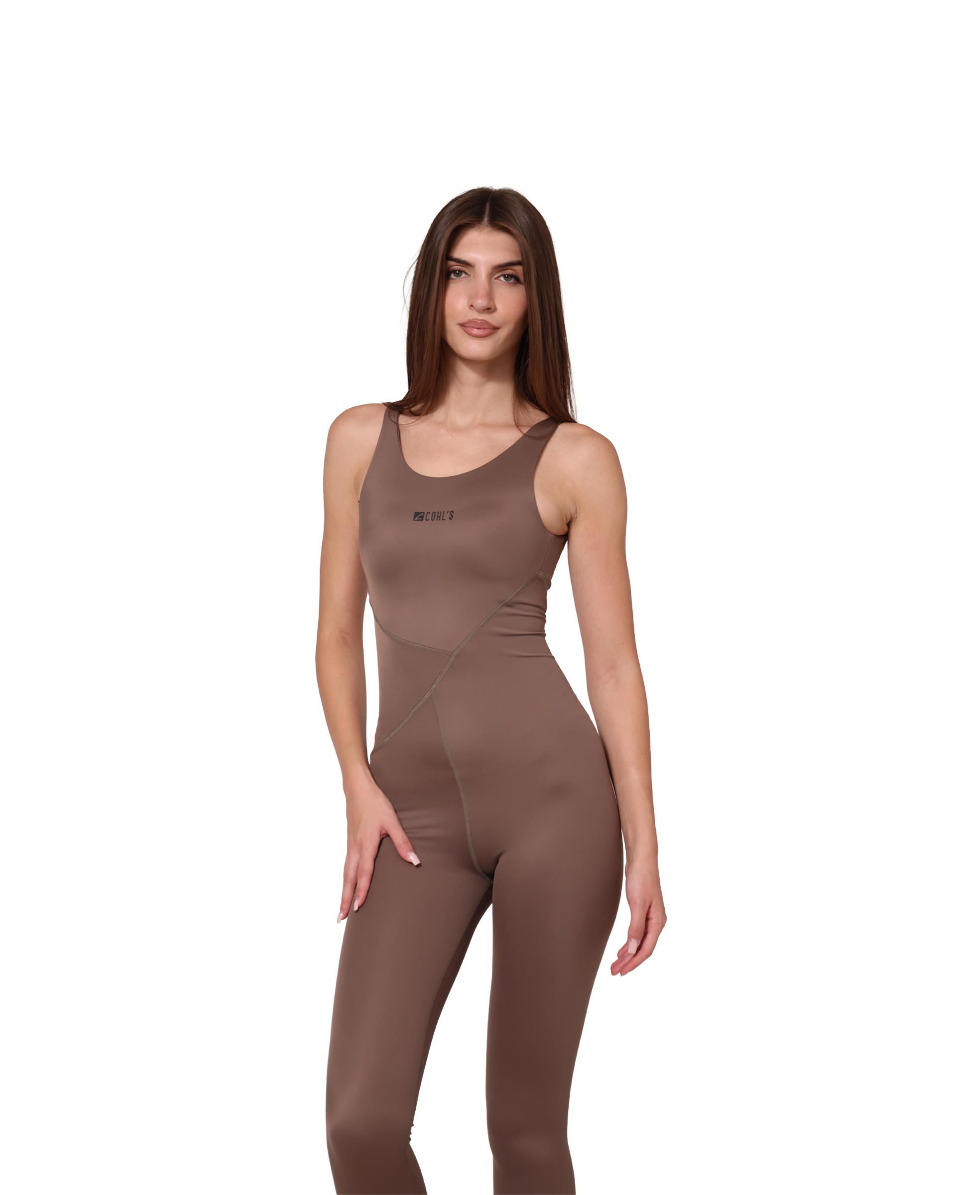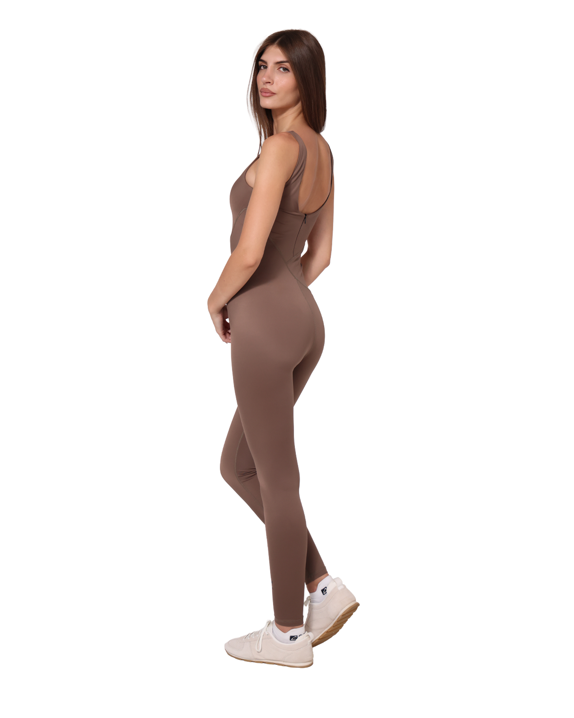 A full-length one piece jumpsuit with tank shoulders and a sculpting fit, made from seamless recycled fabric for comfort, support, and effortless style.